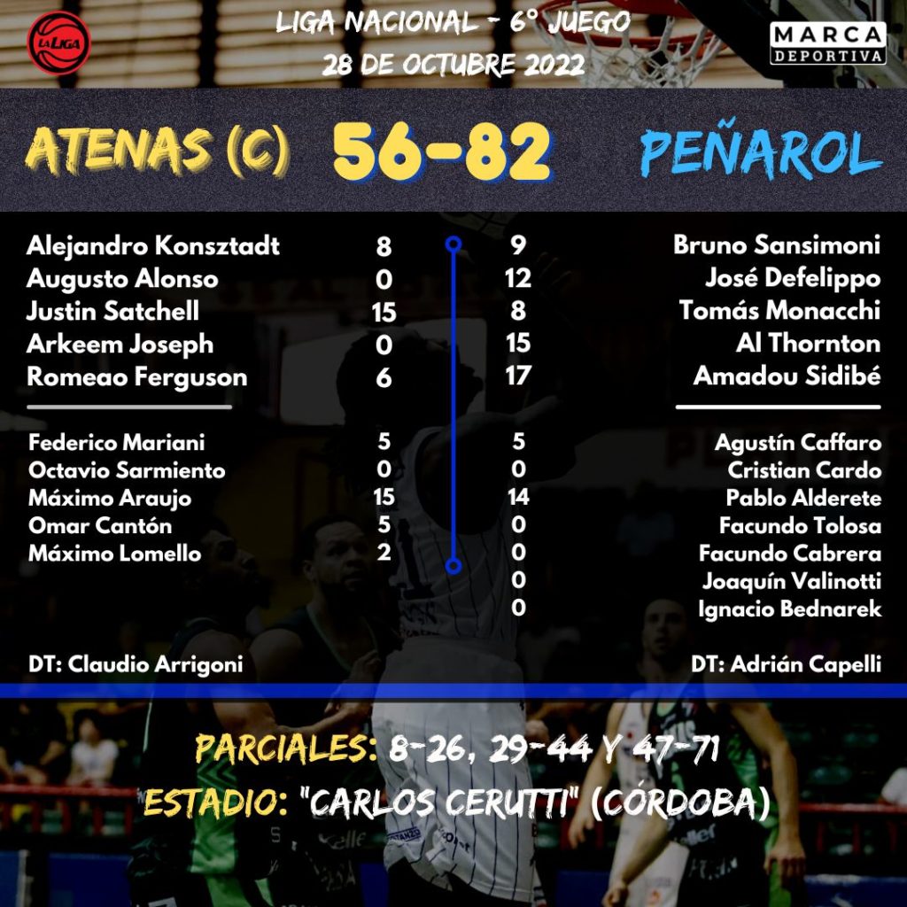 Los últimos 10 minutos serían testimoniales ya que Peñarol hizo lo que quería a lo largo de los 40 minutos llegando a 32 puntos de diferencia con un gran trabajo en la pintura donde se le sumó Pablo Alderete a la tarea destacada de los extranjeros titulares. Una buena manera de comenzar la gira por Córdoba con una victoria necesaria para quedar con 3 triunfos y 3 derrotas, pero ahora, el domingo a las 11.30 tendrá que medirse con Instituto, el último campeón y el líder sólido de la actual competencia.