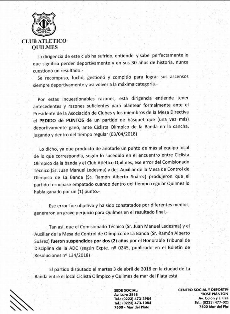 El Club Quilmes realizó un pedido formal a la AdC para que le den por ganado el partido que terminó definiendose con doble suplementario ante Ciclista Olímpico de La Banda indicando que se le anotó un punto más al local a lo largo del partido y generó el empate en 88 durante el tiempo regular. La nota completa.