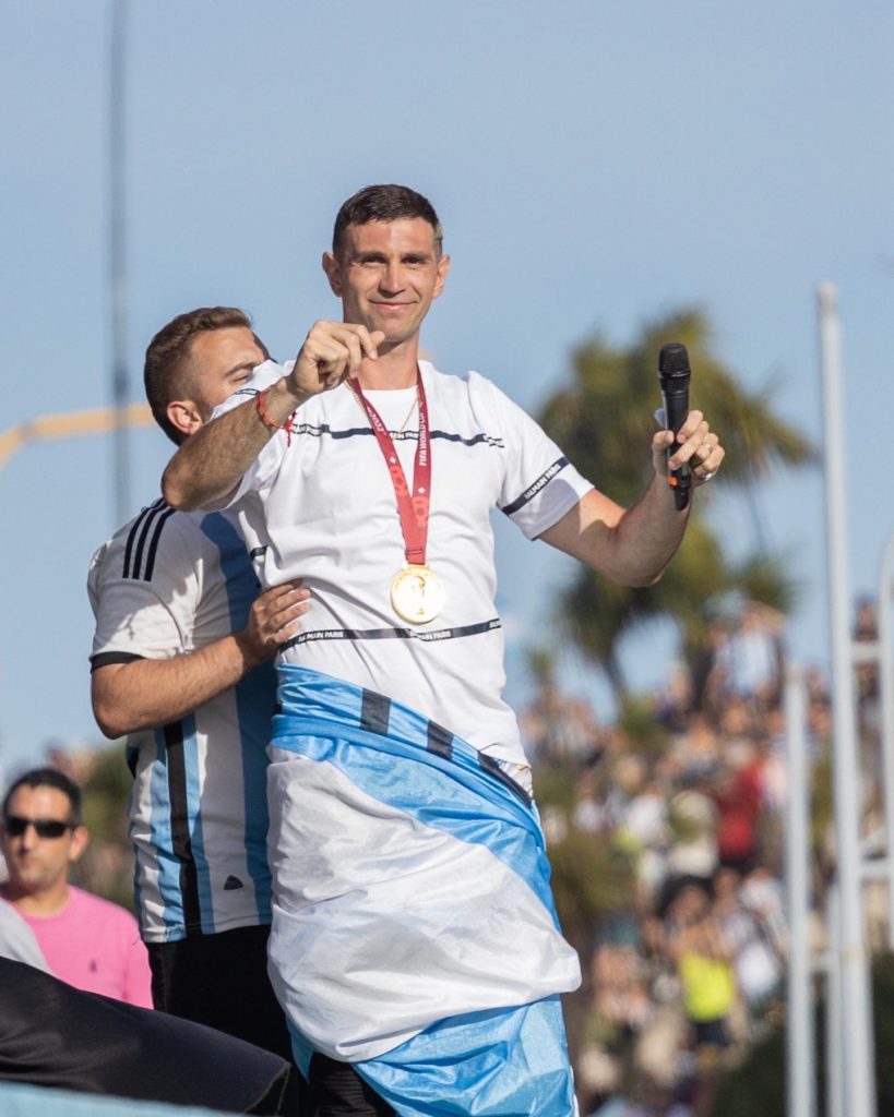 Los más chiquitos de distintos clubes de la ciudad le acercaron una bandera argentina que se puso en la cintura antes de contar algunos detalles, principalmente, su característica más importante: los penales: «en esa situación me hago fuerte y los rivales me respetan, lo sé porque jugadores rivales me lo han dicho. Cuando atajo el primer penal en una final del mundo, se que el otro chico iba a estar nervioso y traté de jugarle mentalmente y la tiró afuera», comentó sobre todo lo que hizo antes del penal de Tchouameni.